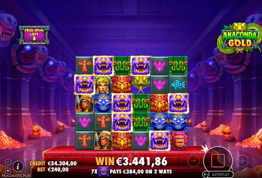 Om zich te onderscheiden van de ‘Gold’-serie, heeft Pragmatic Play een ‘Money Collect’-feature toegevoegd. ‘Money’-symbolen (tot 100x) kunnen op het veld landen. De ‘Anaconda’-feature kan willekeurig twee ‘Anaconda’-symbolen met elkaar verbinden, waarbij alle symbolen op hun pad veranderen in hetzelfde symbool, óf in ‘Money’-symbolen. Als ze in ‘Money’-symbolen veranderen, wordt het laatste symbool een ‘Collector’ die alle waarden int.