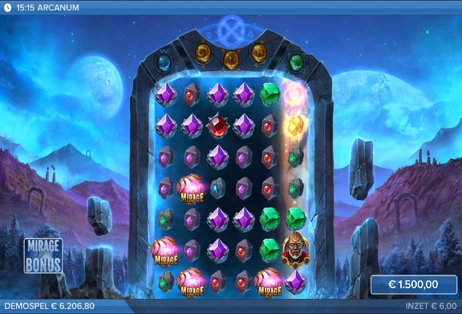De bonus start met 3+ scatters en geeft 7 free spins. Het fijne is dat belangrijke dingen blijven hangen: je inventory, je wizard-tracker, je mirror wizards en je multiplier-setup neem je mee de feature in. Achter clusters kan ook een extra-drop symbool zitten waarmee je +1 free spin pakt. Met 4 scatters speel je een Mirage-variant met extra Mirror Wizard, en met 5 scatters krijg je een nog vollere versie met nog meer Mirror Wizards.