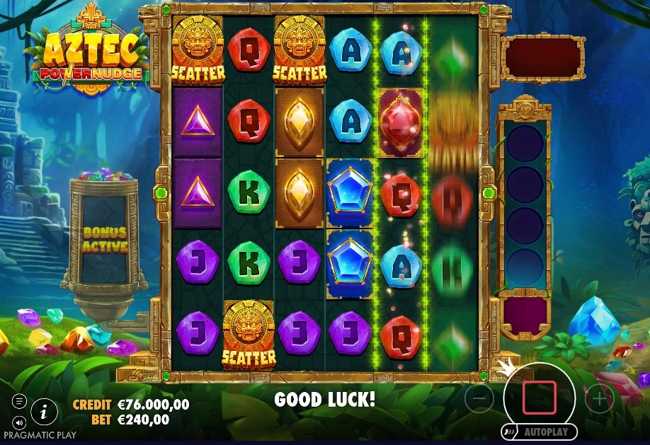 Het avontuur speelt zich af op een groot 6×5 raster. Net als in de legendarische Gates of Olympus, win je door 8 of meer identieke symbolen te landen, waar dan ook op het scherm. Hier houdt de gelijkenis echter op. In plaats van een ‘tumble’, activeert elke winst de Powernudge-feature. De rollen die een winnend symbool bevatten, schuiven (‘nudgen’) één positie naar beneden, waardoor er een nieuw symbool bovenaan verschijnt. Dit proces gaat door zolang er winnende combinaties op het scherm staan. Tijdens deze reeks van nudges kunnen er speciale diamant-multipliers (tot 100x in de basisgame) landen. Aan het einde van de reeks worden alle verzamelde multipliers opgeteld en toegepast op de totale winst. De standaard RTP is een uitstekende 96,46% (kan variëren).