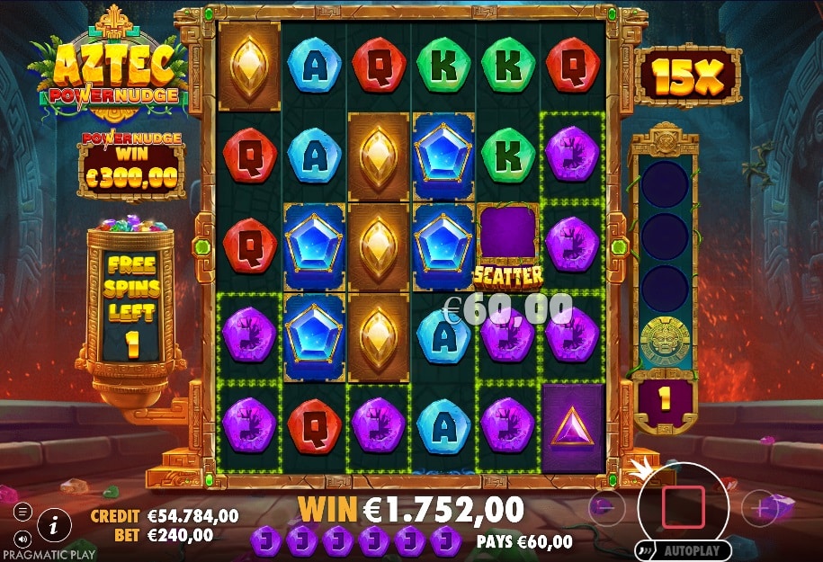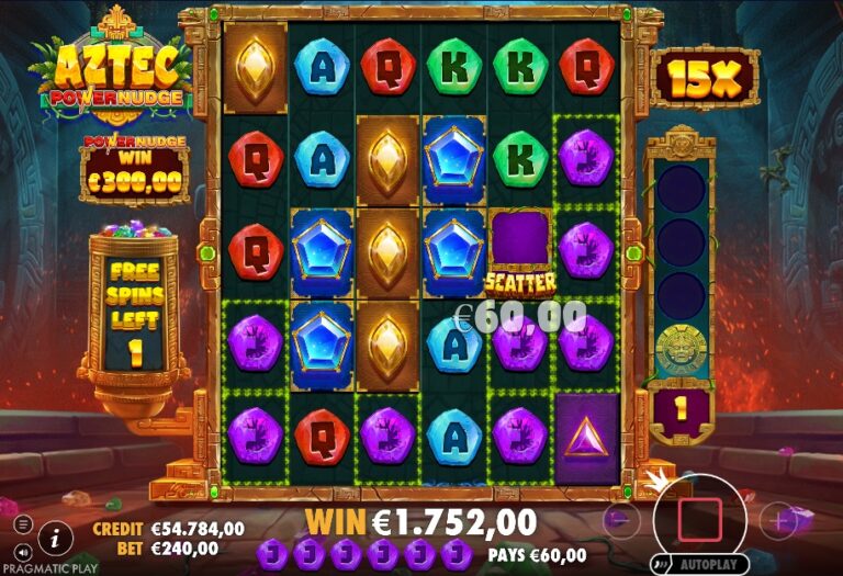 Aztec Powernudge voelt als de meer beheerste, strategische neef van Gates of Olympus. In plaats van chaotische tumbles, krijg je hier de gecontroleerde, bijna hypnotiserende ‘nudges’ waarbij de winnende rollen naar beneden schuiven. De verzamelde multipliers die aan het einde van de rit worden toegepast, zorgen voor een zenuwslopende climax. De free spins-ronde, met zijn gegarandeerde minimumprijs, is een briljante en speler-vriendelijke toevoeging. Een zeer geslaagde en intelligente variant op de ‘pay anywhere’-formule.