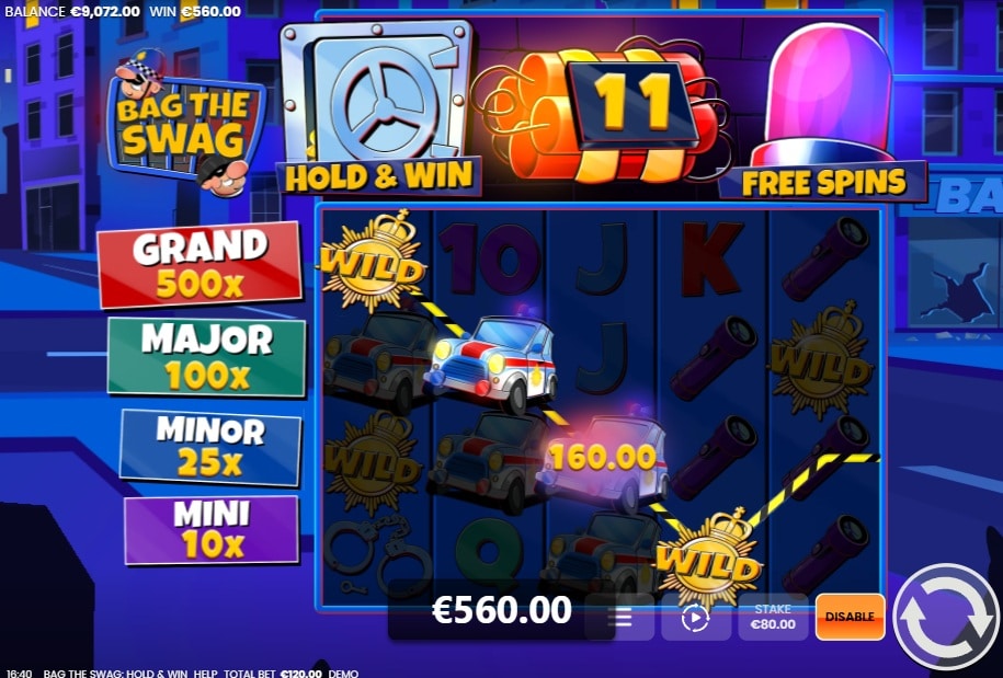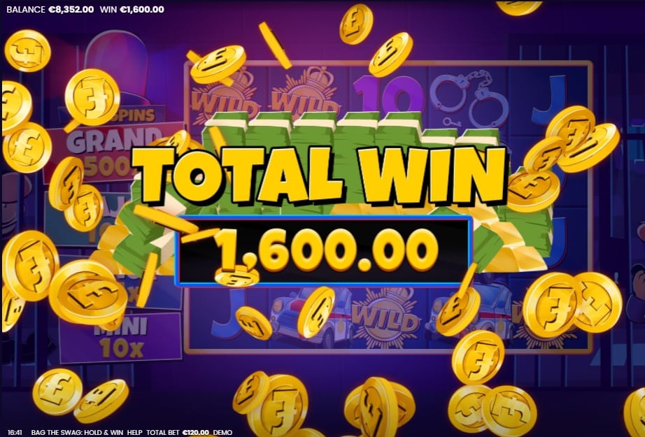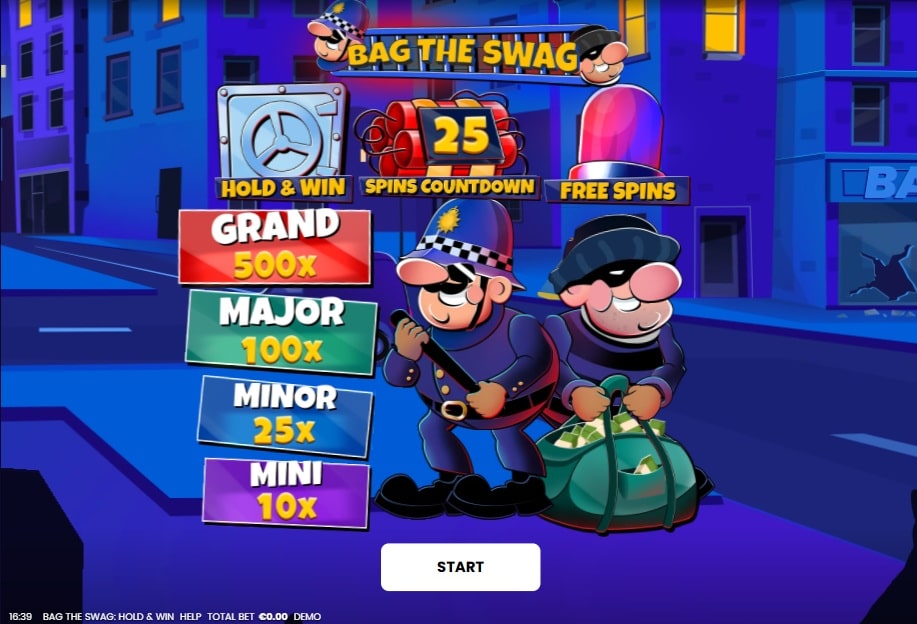 Bag the Swag biedt twee verschillende bonusrondes die beide willekeurig kunnen worden geactiveerd. De Free Spins worden willekeurig gestart door een ‘Badge Wild’-symbool. Je krijgt 10 spins, en als je Level 3 hebt bereikt, blijven alle wilds plakken. De ‘Hold & Win’-bonus wordt willekeurig geactiveerd door een ‘Cash’-symbool. Dit is een klassieke respin-feature waarbij je munten en jackpots (tot 500x) verzamelt. Als je Level 4 hebt bereikt, worden deze winsten aanzienlijk verhoogd door de multiplier.