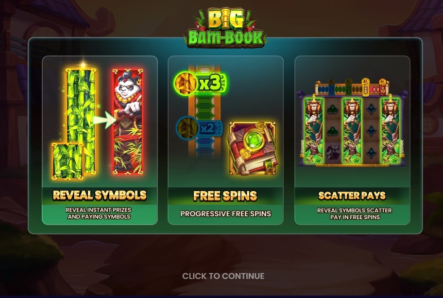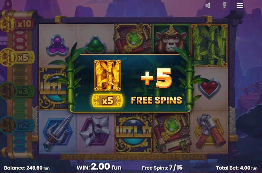 De bonus activeer je met 3, 4 of 5 scatters (het boek met de smaragd). Afhankelijk van het aantal scatters start je met 8 tot 15 gratis spins en begin je mogelijk al op een hoger level. Tijdens de free spins is het doel om zoveel mogelijk nieuwe scatters te verzamelen. Elke vierde scatter zorgt voor een ‘retrigger’ en een level-up. Bij elk nieuw level krijg je extra spins én een hogere multiplier die wordt toegepast op de Instant Prizes van de Golden Bamboo.