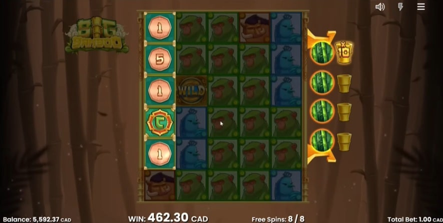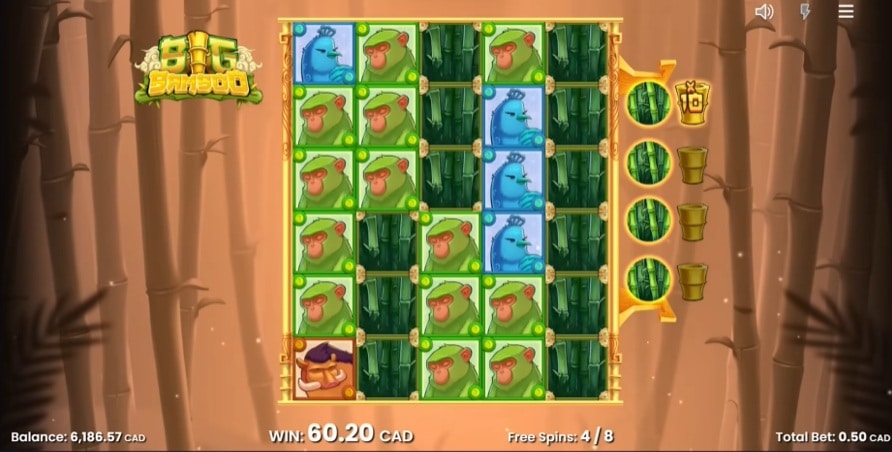 Het activeren van de free spins is een avontuur op zich. Dit gebeurt wanneer je de benodigde scatter-symbolen landt, vaak via de Golden Bamboo feature of via de speciale ‘Gamble Scatter’ op de vierde rol. Eenmaal in de bonusronde begint de ware potentie van Big Bamboo zich te ontvouwen. Naast de rollen zie je een meter met de vier laagst betalende symbolen. Elke keer als er een scatter-symbool landt, wordt deze verzameld in de meter. Zodra je vier scatters voor een symbool hebt verzameld, gebeuren er twee dingen: dat symbool wordt voor de rest van de bonus permanent omgezet in een Mystery Bamboo-symbool, én je krijgt extra gratis spins. Hoe meer symbolen je omzet, hoe vaker de bamboe landt, wat de kans op de Golden Bamboo feature en dus enorme winsten exponentieel vergroot. Voor degenen die niet kunnen wachten, zijn er diverse Bonus Buy opties.