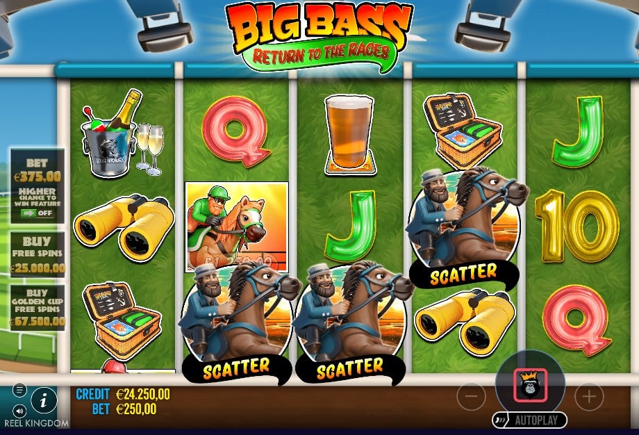 De Big Bass serie krijgt een adrenaline-injectie met Big Bass Return to the Races! Vergeet vissen, dit keer scheur je over de racebaan met jockeys en paarden, terwijl je jaagt op die monsterwinsten. De bekende gameplay van Big Bass is behouden, maar met een frisse, cartoonachtige racesfeer en een soundtrack van opzwepende countrymuziek.