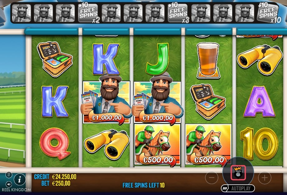Tijdens de reguliere Free Spins verzamelt de jockey Wild alle waardes van de Money symbolen (2x tot 5.000x je inzet!). Elke vierde Wild geeft je 10 extra spins en verhoogt de Money multiplier (2x, 3x, tot maximaal 10x). De Golden Cup Free Spins zijn gestript: alleen Money symbolen, Wilds en lege plekken. Ook hier verzamel je Wilds voor extra spins en multipliers tot 10x. Houd je ogen open voor random features tijdens de Free Spins: verschijnende Money symbolen, een lasso die Wilds op de rollen trekt, of een gordijnanimatie die symbolen verandert.