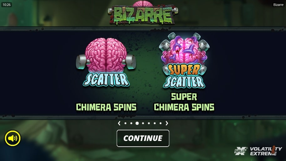 De ware genialiteit van Bizarre zit in de drie, in elkaar overlopende, bonusrondes. Het aantal spins wordt bepaald door het type scatter (normaal = 2 spins, super = 3 spins) waarmee je de bonus activeert.