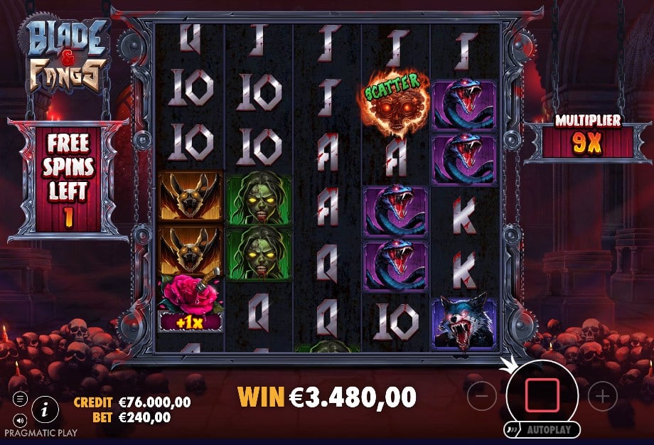 Vallen ze samen in de base game, dan versmelten beide schermen tot één 5×6-opstelling en krijg je een respin. Tijdens die respin staat er standaard al een x2 multiplier aan, en elke extra roos kan ‘m verder opvoeren. Daarna splitst alles weer terug naar twee schermen. Dat maakt Blade & Fangs demo best spannend: je speelt veel “normale” spins, maar als die rozen tegelijk komen, kan het ineens hard gaan.