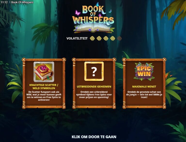 Stel je voor dat je een ‘Book of’-gokkast wilt maken in 2025. Zou je dan niet proberen om er een unieke, moderne twist aan te geven? Misschien meerdere expanderende symbolen? Een progressieve multiplier? Iets, wat dan ook? Trusty Gaming’s antwoord op deze vraag is een volmondig en oorverdovend ‘nee’. Book of Whispers is de meest basale, kale en onverbloemde kopie van Book of Dead die je maar kunt vinden. De free spins hebben één expanderend symbool. Punt. Einde verhaal. Het is functioneel, maar zo inspiratieloos en overbodig in de huidige markt dat het bijna pijnlijk is. Een perfect spel voor als je Book of Dead wilt spelen, maar dan om de een of andere reden met een jungle-thema.