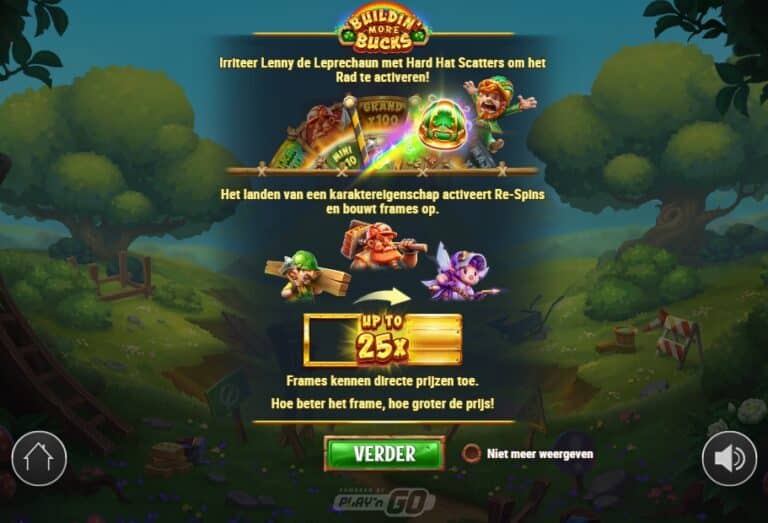 De meest charmante bouwvakkers uit de gokkast-wereld zijn terug aan het werk in Buildin’ More Bucks, het vervolg van Play’n GO op het originele Buildin’ Bucks. In dit spel, dat zich afspeelt in een vrolijke, sprookjesachtige bouwwereld, help je een team van een elf, een dwerg en een fee met het bouwen van huizen. De gameplay is een meesterwerk van progressie. De kern van het spel is het ‘Frame Upgrade System’. Je bent niet zomaar aan het spinnen; je bent constant bezig met het plaatsen en upgraden van ‘frames’ op het speelveld, van hout naar steen en uiteindelijk naar goud. Deze opgebouwde frames worden vervolgens geactiveerd in een van de drie verschillende, karakter-specifieke respin-rondes, die je kunt winnen via een prijzenwiel. Met een verhoogde maximale winst van 7.500x de inzet, is dit een bouwproject met een solide fundering.