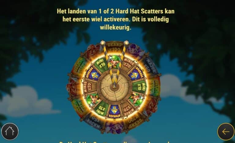 Het bouwproject vindt plaats op een 5×3 raster met 243 manieren om te winnen. De basisgame is een constante voorbereiding op de bonusfeatures. Elke keer dat er een ‘Hard Hat’-scatter landt, plaatst het een houten frame op die positie. Een volgende scatter op dezelfde plek upgrade het frame naar steen, en vervolgens naar goud. De ware spanning in de basisgame komt van de ‘Spin the Wheel’-feature. Deze kan willekeurig worden geactiveerd door slechts 1 of 2 scatters te landen. Dit tweedelige prijzenwiel kan directe geldprijzen (jackpots), een upgrade naar een beter wiel, of een van de drie karakter-bonussen toekennen.
