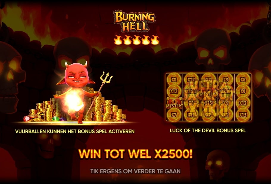 Burning Hell is een fascinerende gokkast die de speler constant uitdaagt. Ga je voor de betrouwbare potentie van de uitklappende wilds in de free spins, of hoop je op de explosieve jackpots van de ‘Hold & Spin’-bonus? De toevoeging van een ‘Gamble’-feature (kaartspel) voegt nog een extra risicollaag toe. Het spel is een slimme mix van stijlen die zowel fans van klassiekers als moderne features zal aanspreken. Durf jij de hitte aan? Speel de Burning Hell demo!