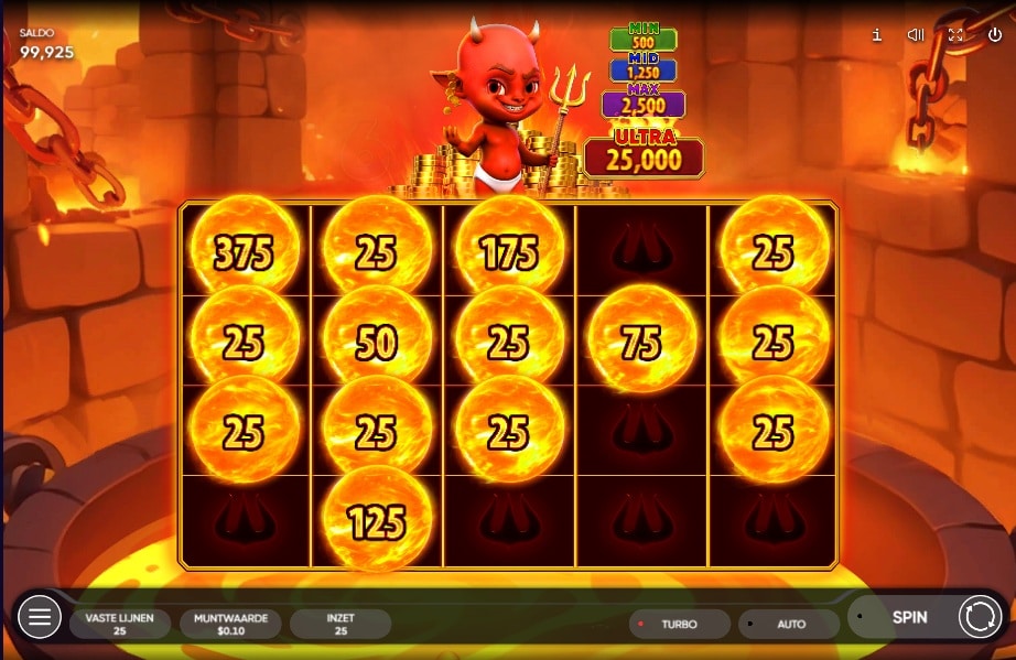 - Luck of the Devil (6+ Fireballs): Dit is de ‘Hold & Spin’-bonus. Je krijgt 3 respins die resetten. Je verzamelt ‘Fireball’-symbolen (geldprijzen), ‘Collector’-symbolen (die alles innen) en ‘Mystery’-symbolen (die jackpots onthullen). Het vullen van het scherm levert de Ultra Jackpot van 1.000x op.