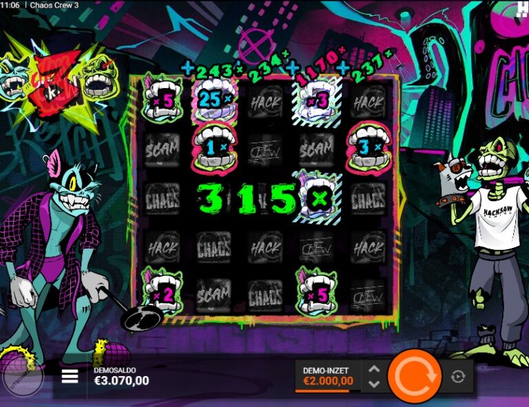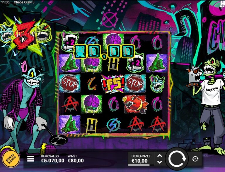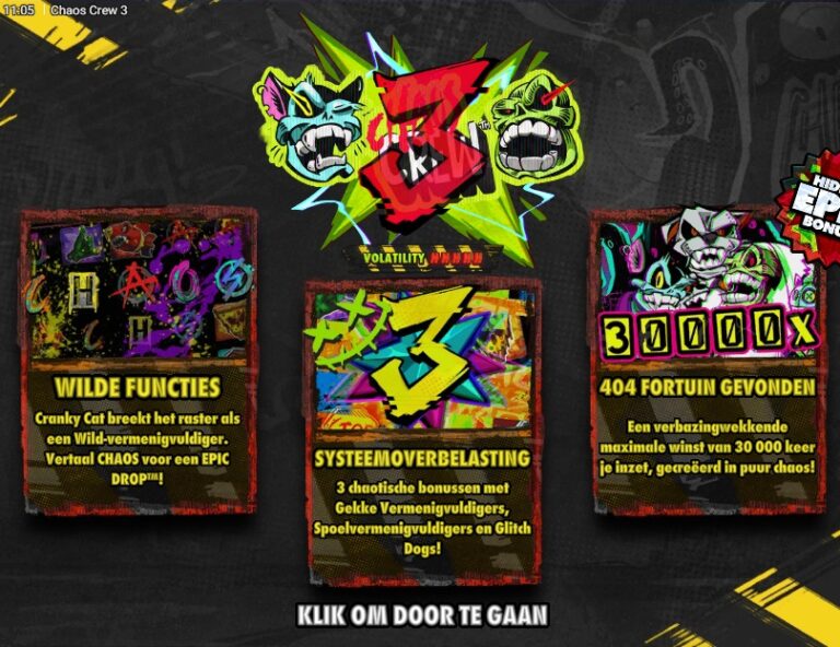 De koningen van de chaos, Cranky Cat en Sketchy Skull, zijn terug en ze hebben versterking meegenomen! Maak je klaar voor Chaos Crew 3, het derde en misschien wel meest gestoorde deel in de legendarische, anti-establishment gokkasten-serie van Hacksaw Gaming. Dit nieuwe avontuur bouwt voort op de geliefde ‘hold-and-win’-stijl bonusronde van zijn voorgangers, maar introduceert een nieuw, onvoorspelbaar crewlid: de ‘Glitch Dog’. Deze rottweiler brengt een nieuwe laag van dynamiek en spanning, zowel in de nieuwe ‘Epic Drop’-feature als in de gelaagde bonusrondes. De sfeer is nog steeds even grimmig en doordrenkt van graffiti en punk-ethos, maar de potentie is verder opgeschroefd naar een duizelingwekkende maximale winst van 30.000x de inzet. Dit is de Chaos Crew-formule, verfijnd en geperfectioneerd.