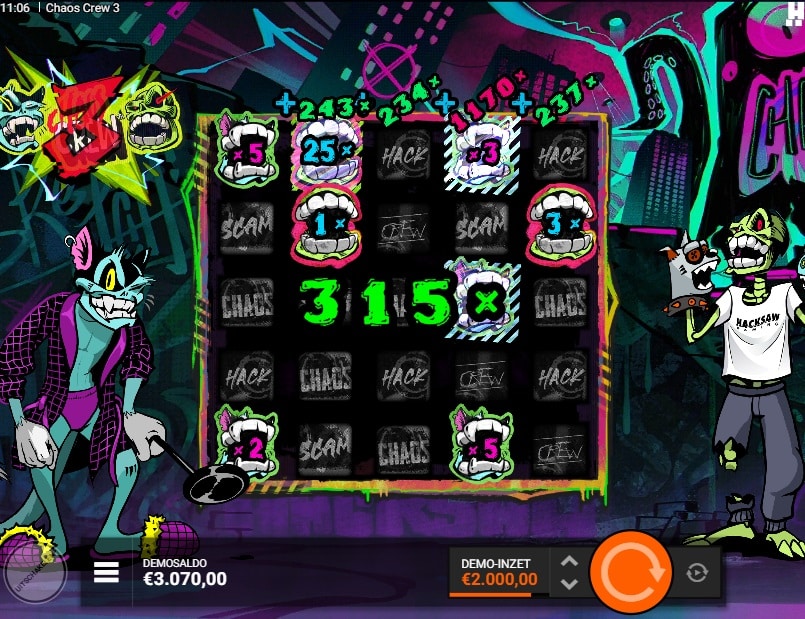 Het spel speelt zich af op een 5×5 raster met 19 vaste winlijnen, te midden van een kleurrijke, chaotische en met graffiti bespoten achtergrond. De basisgame wordt gedomineerd door twee krachtige features. Ten eerste is er de bekende Cranky Cat. Dit is een Wild-symbool met een multiplier tot x20. Als meerdere katten deel uitmaken van een winst, worden hun waardes met elkaar vermenigvuldigd. De grote, nieuwe toevoeging is de Epic Drop feature. Deze wordt geactiveerd door de laagbetaalde symbolen te landen in de volgorde ‘C-H-A-O-S’ op een winlijn. Je krijgt dan één speciale spin op een leeg veld, waar vijf ‘Glitch Dog’-symbolen landen. Deze honden springen naar willekeurige posities en onthullen vervolgens krachtige ‘Crazy Multiplier’-symbolen die de multipliers boven de rollen opbouwen voor een enkele, potentieel enorme, uitbetaling. De standaard RTP is een prima 96,18% (kan variëren).
