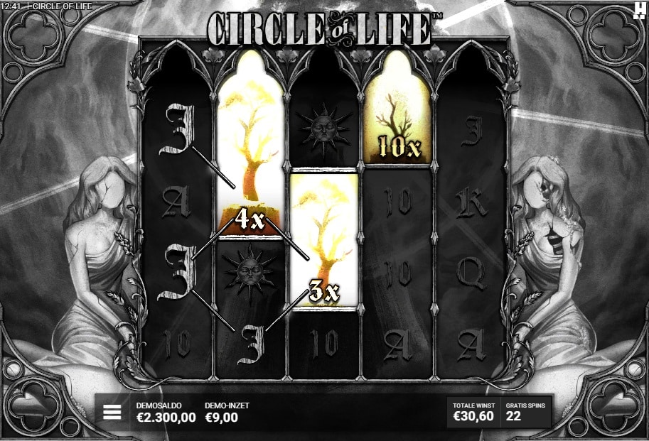 Wanneer een boom de bovenkant van het speelveld bereikt activeert de ‘Circle of Life’ feature. Een cirkel verschijnt en draait om multipliers toe te voegen of te vermenigvuldigen met de waarde van de boom. Dit gaat door totdat de pijl op een doodshoofd landt. Het is een zenuwslopend moment waarbij je hoopt dat de dood nog even op zich laat wachten.