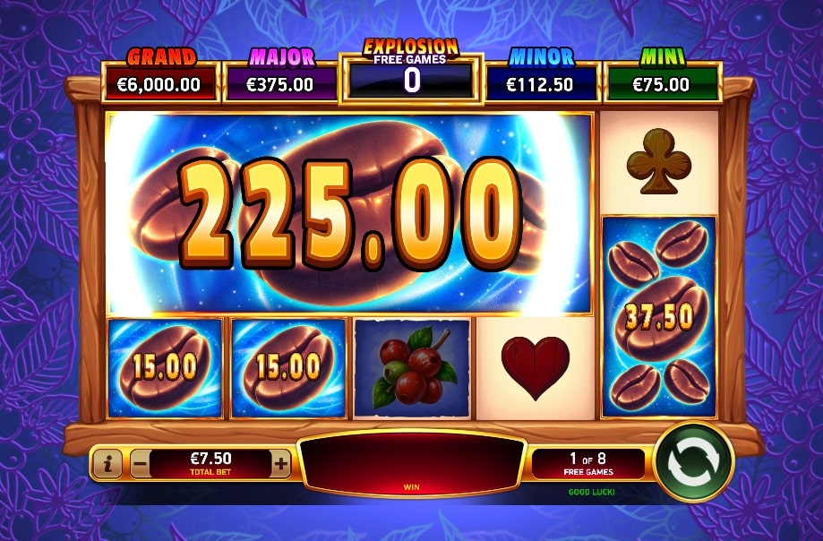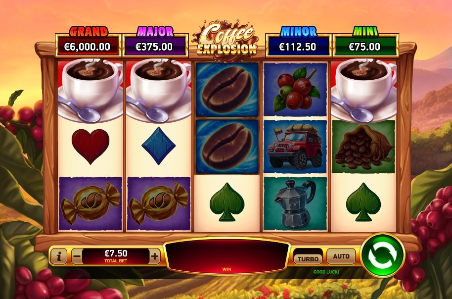 Het avontuur speelt zich af op een 5×3 raster met 50 vaste winlijnen, tegen een prachtige achtergrond van een koffieplantage in de heuvels. De basisgame draait om de jacht op twee verschillende bonus-triggers. Ten eerste kan elk Wild-symbool (de ‘Coffee Explosion’-wild) op willekeurige wijze de ‘Jackpot Pick Deluxe’-feature activeren. Dit is een ‘pick-me’-spel waarbij je gegarandeerd één van de vier vaste jackpots wint (Mini, Minor, Major, of de Grand van 800x), mogelijk zelfs met een x10 multiplier. Ten tweede jaag je op 6 of meer ‘Prize’-symbolen (koffiebonen) om de hoofd-bonusronde te activeren.