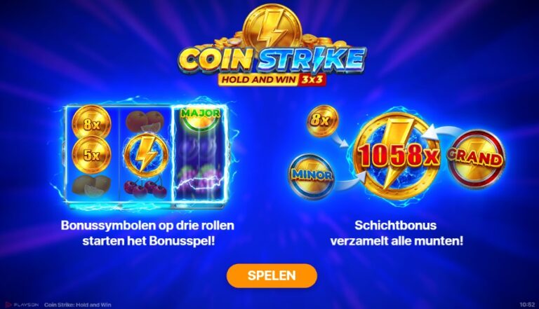 Coin Strike: Hold & Win is een klassieke 3×3 fruitautomaat die aan de anabolen is gezet. De basis is pure nostalgie, maar de ‘Hold and Win’-bonusronde is moderne, explosieve actie. De ‘Coin Strike’-feature, waarbij een speciaal symbool op de middelste rol alle andere prijzen opzuigt, is een simpele maar zeer effectieve toevoeging die voor enorme winsten kan zorgen. Het is de perfecte, ongecompliceerde gokkast voor een snelle sessie: makkelijk te begrijpen, maar met de potentie voor een serieuze elektrische schok in de bonus. De ietwat lage RTP is het enige kleine minpuntje in deze verder energieke en zeer vermakelijke fruitmand.