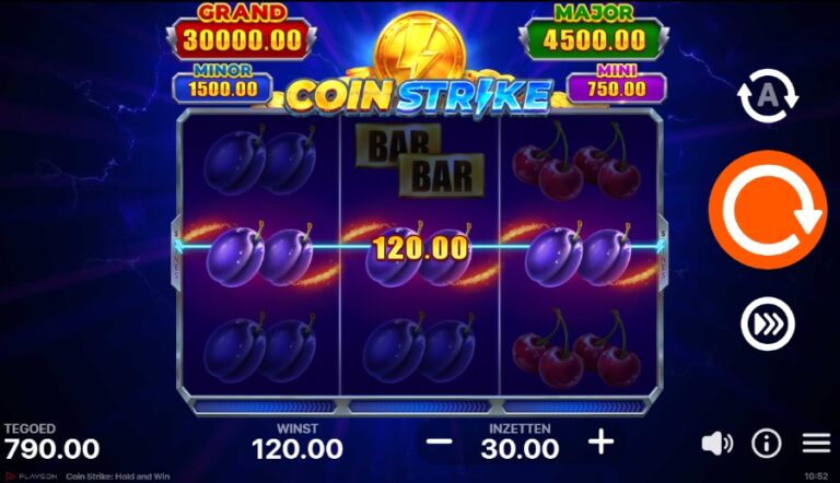 Bereid je voor op een elektrische schok van nostalgie in Coin Strike: Hold & Win, een gokkast van Playson en een van de populairste slots van TOTO Casino. Dit spel neemt de geliefde, klassieke 3×3 fruitautomaat-opzet en injecteert deze met een moderne, hoog-voltage dosis van de populaire ‘Hold and Win’-mechaniek. De sfeer is een energieke mix van oud en nieuw: de rollen zijn gevuld met de vertrouwde kersen, bellen en zevens, maar de achtergrond knettert van de bliksem en de soundtrack is een opzwepende urban beat. De gameplay is snel en direct, met de volledige focus op het activeren van de bonusronde. Hier wordt het klassieke ‘hold-and-win’-spel verrijkt met de unieke ‘Coin Strike’-feature, een krachtige ‘collector’ die alle prijzen in één klap kan binnenhalen. Met een solide maximale winst van 5.150x de inzet, is dit de perfecte gokkast voor liefhebbers van klassiek met een moderne punch.