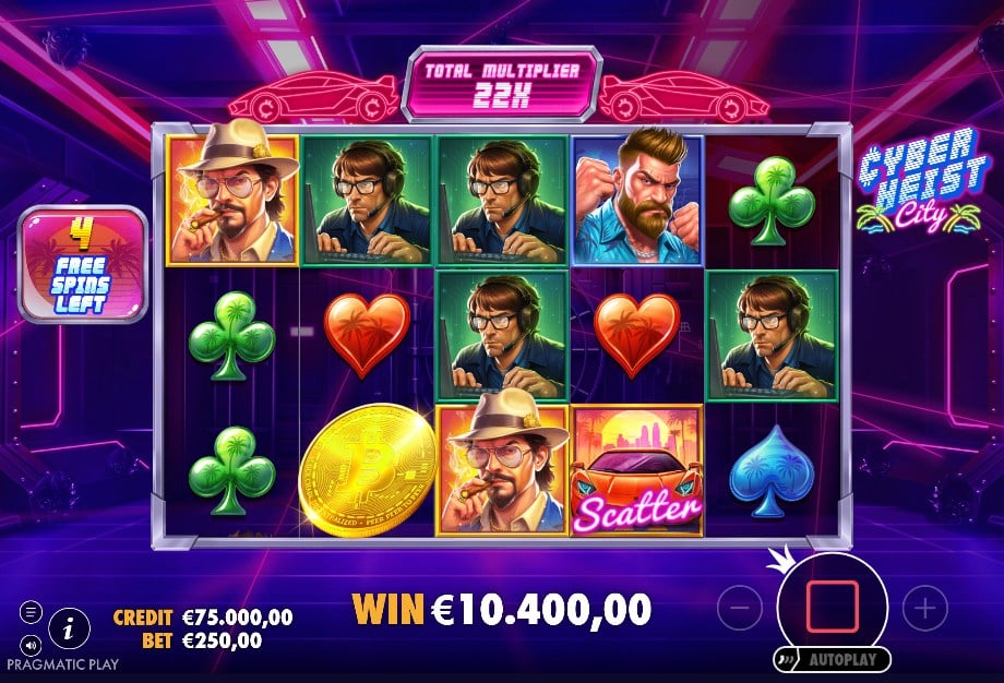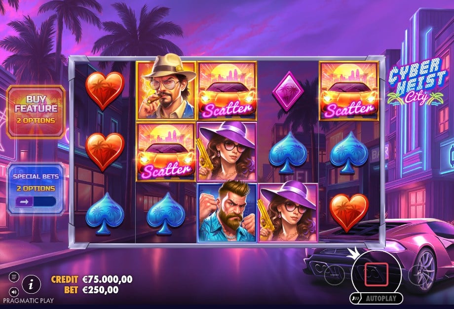 In de Cyberheist City demo gooit Pragmatic Play je midden in een synthwave-overval: paarse neon, palmbomen, een crypto-bank en een crew die eruitziet alsof ze zo uit een actiefilm zijn gelopen. Het speelt lekker vlot op een 5×3-grid met 243 ways to win, dus geen vaste lijnen, wél veel “net niet”-momentjes die ineens kunnen omslaan in een dikke tumble-run.