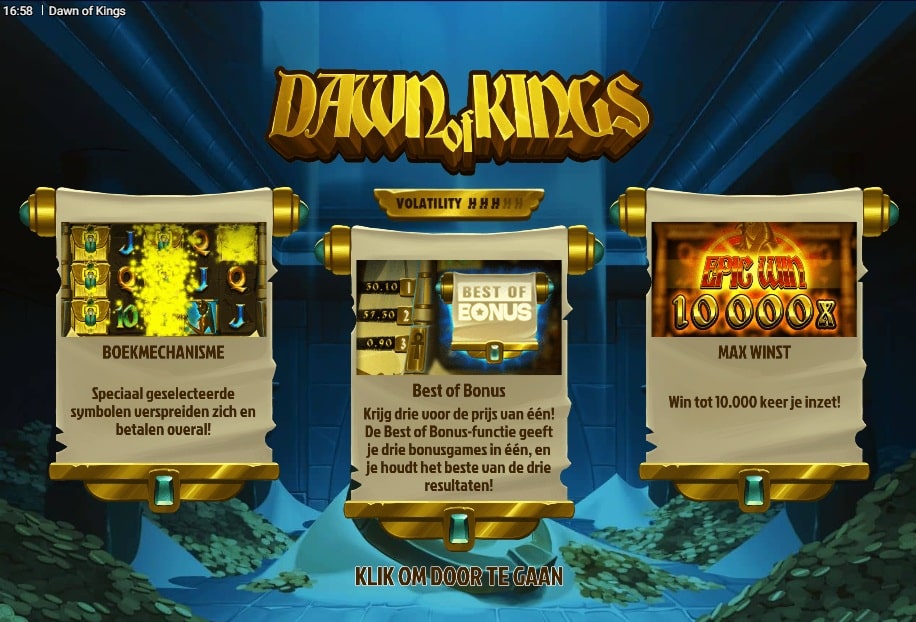 De maximale winst is vastgesteld op 10.000 keer de inzet, wat een verdubbeling is van de standaard 5.000x in dit genre. In de demo kun je via het Bonus Buy menu alle varianten uitproberen, van simpele spins tot de peperdure ‘Best Of Triple Book’ optie. Let wel: in Nederland mag je voor echt geld geen bonussen kopen. Benieuwd of jij de schatkamer kunt plunderen? Sla het boek open in de Dawn of Kings demo hierboven of speel voor echt geld bij ComeOn of TOTO.
