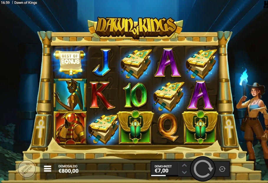 Sommige thema’s in de online casino wereld zijn onvermijdelijk. Je hebt Ierse kabouters, vrolijke vissers en natuurlijk het eeuwige Egypte. Hacksaw Gaming staat bekend om hun originele en soms wat duistere spellen, maar met de Dawn of Kings demo wagen ook zij zich aan het klassieke ‘Book of’-genre (zoals Book of Dead). We maken kennis met Amy Dawn, een stoere ontdekkingsreizigster die zo uit een film van Indiana Jones lijkt te zijn weggelopen. Het doet een beetje denken aan Floortje Dessing die in ‘Floortje naar het einde van de wereld’ plotseling een piramide ontdekt en besluit om schatzoeker te worden. De sfeer is mysterieus, met een blauw verlichte grafkamer vol met godenbeelden en hiërogliefen.