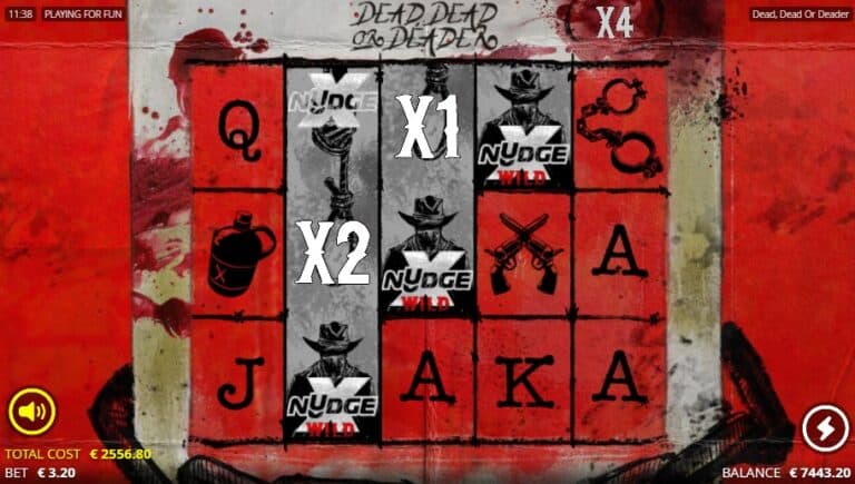 - 12 Dead Spins (3 scatters): Speelt als de basisgame, maar de xNudge Wilds zijn ‘sticky’ voor minimaal één extra spin, en hun multiplier verdubbelt voor de volgende spin.