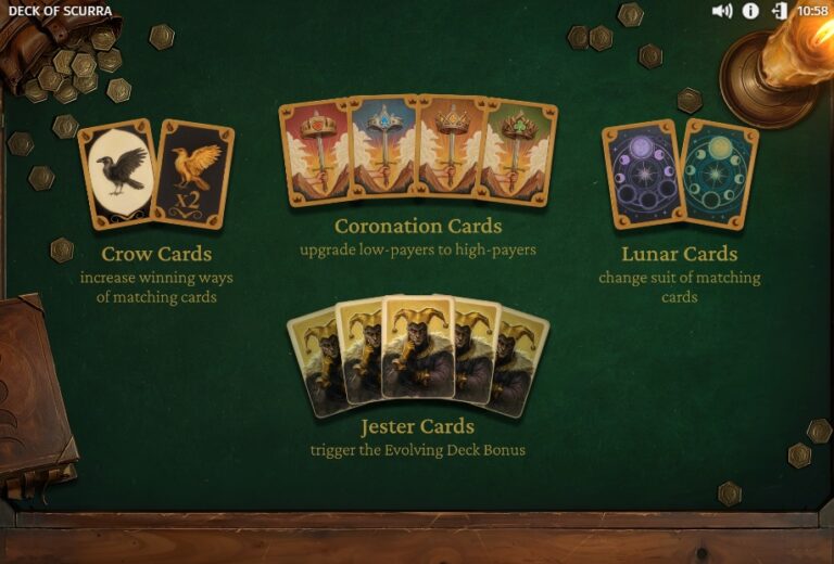 Deck of Scurra is de ‘schaken-onder-de-gokkasten’. Het is een diepgaand, strategisch en intellectueel spel, vermomd als een prachtig vormgegeven kaartspel. Je bent niet passief aan het spinnen; je bent actief bezig met het onthullen en toepassen van ‘Alteration Cards’ om je deck te verbeteren voor een ultieme, allesbepalende laatste zet. De ‘Evolving Deck Bonus’, waarin je speelt met een permanent verbeterd deck, is de briljante climax. Het is een gokkast die je aandacht vereist en je beloont voor je inzicht. Een absolute triomf voor de denkende speler die houdt van een complexe en gelaagde uitdaging.