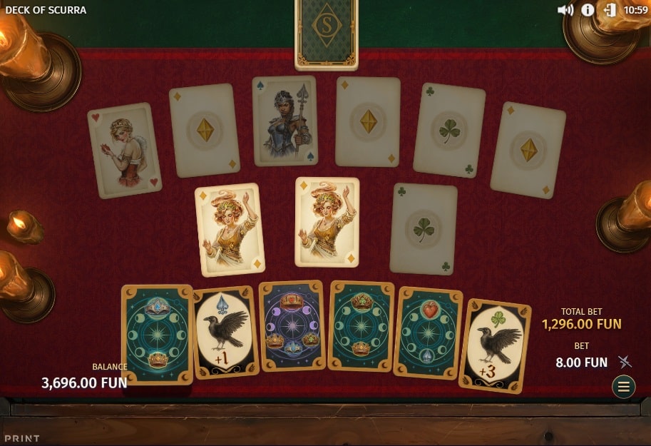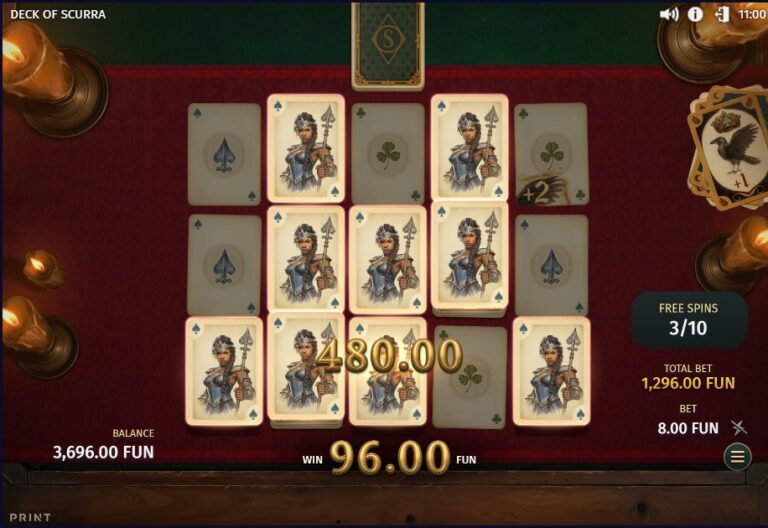 Vergeet de draaiende rollen en de standaard symbolen; in Deck of Scurra van Print Studios speel je een mysterieus en elegant kaartspel. Dit is geen gokkast in de traditionele zin van het woord, maar een diepgaande en strategische ervaring die aanvoelt als een fusie tussen een slot en een tactisch kaartspel. De sfeer is die van een exclusieve, middeleeuwse salon, compleet met een raadselachtige soundtrack. De gameplay is revolutionair: je bent niet zomaar aan het spinnen, je bent een ‘levend’ deck aan het bouwen en verbeteren. De kern van het spel zijn de ‘Alteration Cards’, speciale kaarten die je onthult door winsten te vormen. Deze kaarten pas je vervolgens toe om je deck te upgraden met krachtige modifiers. Dit alles bouwt op naar de ‘Evolving Deck Bonus’, waar je deck permanent is verbeterd. Met een indrukwekkende maximale winst van 20.000x de inzet, is dit een spel voor de denkende gokker.