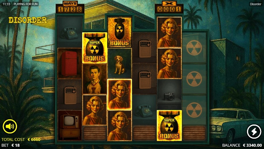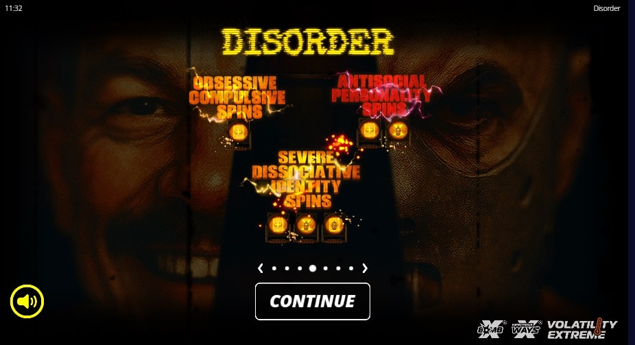 De ware genialiteit van Disorder zit in de drie, in elkaar overlopende, bonusrondes. Het aantal spins wordt bepaald door het type scatter (normaal = 2 spins, super = 3 spins) waarmee je de bonus activeert.