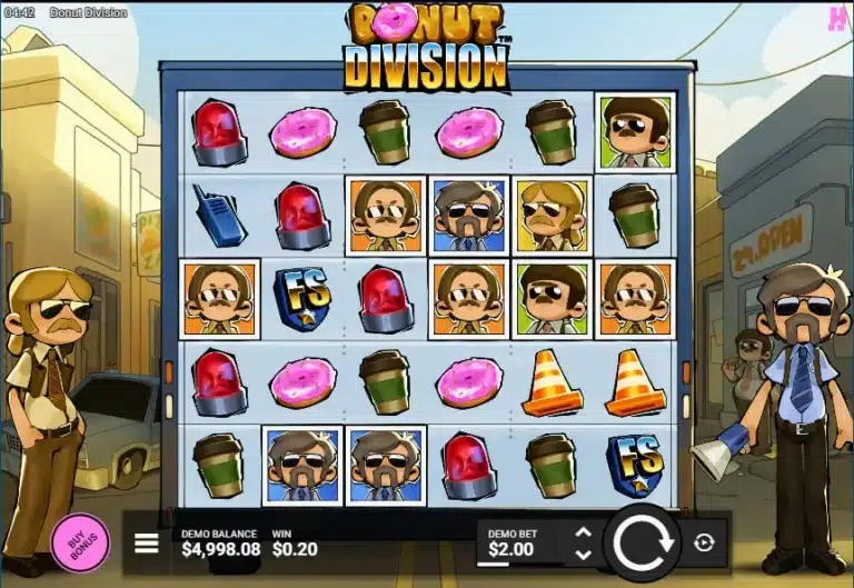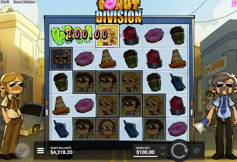 Donut Division wordt gespeeld op een 6×5 raster met 19 vaste winlijnen. De symbolen, van koffiebekers en donuts tot de vier agenten van het korps, dragen bij aan de luchtige sfeer. De belangrijkste feature in de basisgame is de Gooey Gun. Dit speciale Wild-symbool kan landen met een multiplier tot wel x100. Wanneer het landt, schiet het een spoor van Gooey Wilds naar links over de hele rij. De Gooey Gun verandert vervolgens zelf ook in een wild. Alle wilds op die rij krijgen de multiplier van het wapen, en als meerdere van deze wild-rijen deel uitmaken van een winst, worden hun multipliers bij elkaar opgeteld. Dit zorgt voor een constante dreiging van grote winsten in het basisspel. De standaard RTP is een solide 96,3% (kan variëren) en de volatiliteit is medium.