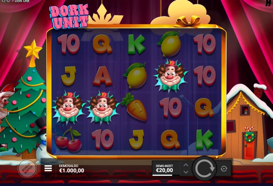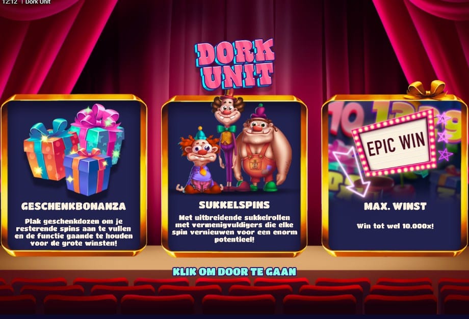 Vergeet de donkere steegjes en grimmige monsters; Hacksaw Gaming neemt een verrassende en kleurrijke afslag met Dork Unit. Na een reeks van intense en duistere gokkasten, voelt dit spel als een frisse, vrolijke wind. Je stapt een soort kindertheater binnen waar drie maffe clowns, Tiny Timmy, Hefty Hector en Long Lenny, de show stelen. De sfeer is luchtig en de graphics zijn helder en cartoonesk, wat een welkome afwisseling is. Maar laat je niet misleiden door het onschuldige uiterlijk. Onder deze vrolijke façade schuilt de kenmerkende kracht van Hacksaw Gaming: een spel vol met krachtige wild multipliers en een gigantische maximale winst van 10.000x de inzet. Wat dit spel extra bijzonder maakt, is de toegankelijke medium volatiliteit, een zeldzaamheid voor deze provider.