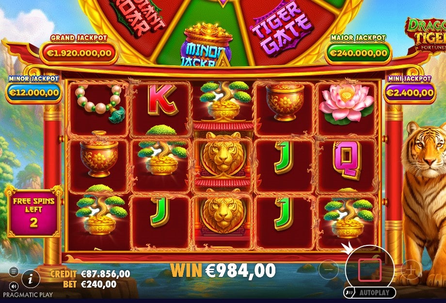 Dragon Tiger Fortunes is een uitgesproken Aziatisch themafeestje van Pragmatic Play: kersenbloesem, goud, pagodes en natuurlijk een draak en tijger die allebei vinden dat ze de baas zijn. In de Dragon Tiger Fortunes demo merk je al snel dat de looks vooral de voorkant zijn. Daarachter zit een gokkast die stiekem best wat lagen heeft, met free spins waarin vakjes upgraden én een wheel-bonus die je bonusronde compleet kan omgooien.