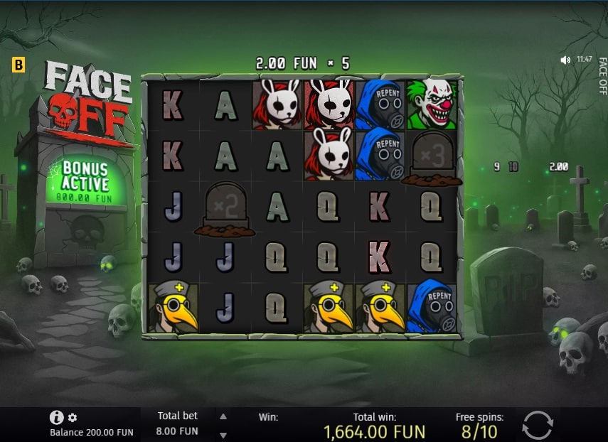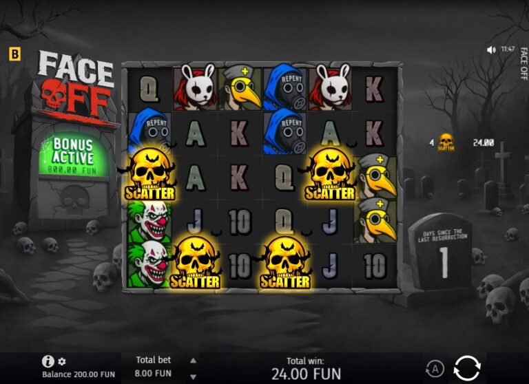 Zet je schrap voor een nachtmerrie op de rollen in Face Off, een nieuwe en angstaanjagende gokkast van BGaming. In dit spel, dat aanvoelt als een klassieke ‘slasher’-film, word je op een verlaten kerkhof geconfronteerd met vier gemaskerde maniakken. Dit is geen spel voor bangeriken; de sfeer is grimmig, de spanning is constant voelbaar, en de gameplay is meedogenloos. Voor de ervaren speler zal de onderliggende motor echter direct bekend aanvoelen. Face Off is in essentie de duistere en meer volatiele tweelingbroer van de legendarische gokkast Gates of Olympus. Het spel gebruikt dezelfde briljante ‘Pays Anywhere’-mechaniek met tumbles en accumulerende multipliers in de bonusronde. De grote twist? De maximale winst is met 15.000x de inzet maar liefst verdrievoudigd.