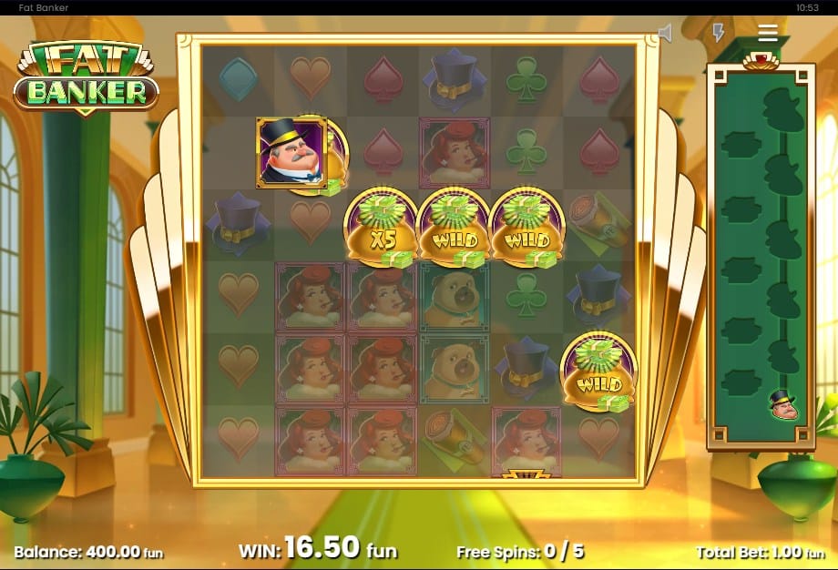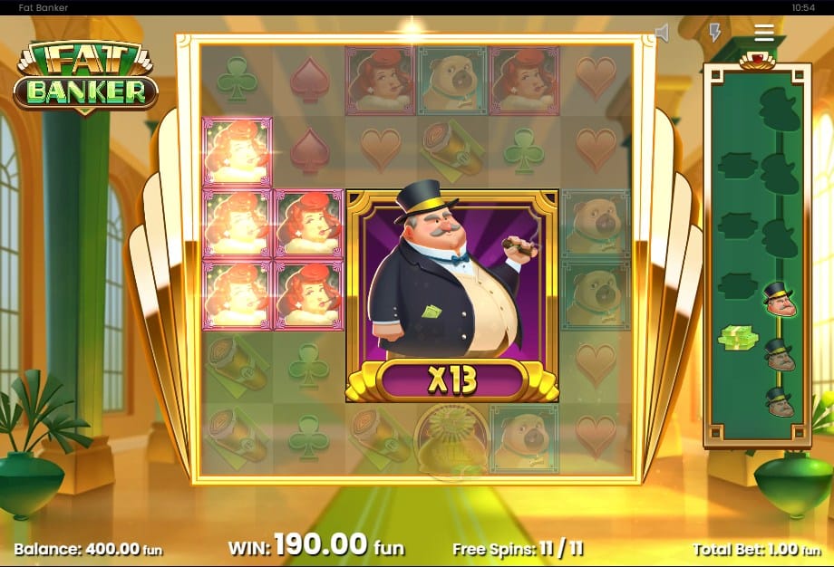 De hoofdattractie blijft natuurlijk de Free Spins ronde, waarin de dikke bankier (Wild) over het scherm beweegt om geldzakken te verzamelen. Hoe meer hij eet, hoe groter hij wordt (tot 6×6!). Dit kennen we natuurlijk van onder andere Fat Rabbit. Wat deze versie uniek maakt, is dat de geldzakken nu ook multipliers kunnen hebben. De bankier verzamelt deze multipliers en past ze toe op alle winsten waar hij deel van uitmaakt. Dit betekent dat een gigantische Wild niet alleen veel winlijnen raakt, maar ook nog eens de winst enorm kan vermenigvuldigen. De maximale winst ligt op 25.000 keer je inzet.