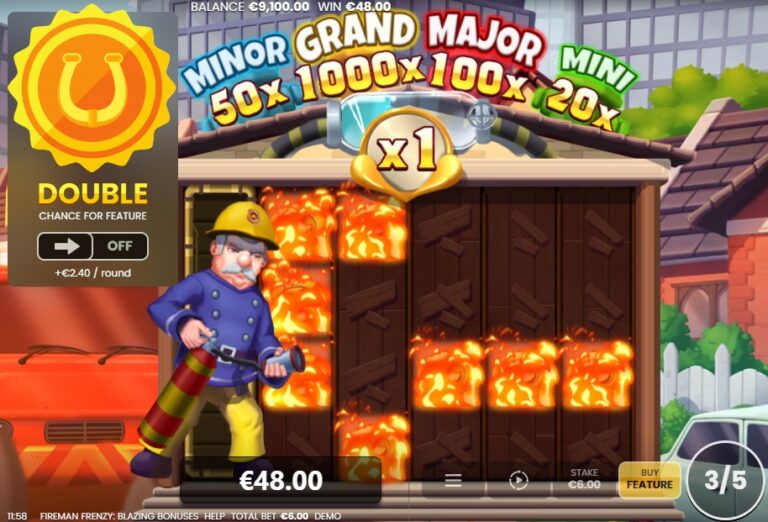 Wanneer je 3 of meer ‘brandalarm’-scatters landt, begint de ware ‘frenzy’ met 5 gratis spins. De gameplay krijgt nu een reeks krachtige upgrades: het speelveld breidt uit naar een 6×4 raster en er landt een gegarandeerde Brandweerman Wild op elke spin. Bovendien is er een ‘Progress Bar’ actief, die sterk doet denken aan de klassieker Big Bass Bonanza. Elke keer dat je een munt ‘blust’, vul je de meter. Het voltooien van een level levert je extra gratis spins op en verhoogt een globale multiplier (tot x5) die van toepassing is op alle toekomstige ‘collect’-winsten.