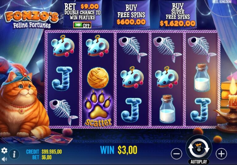 Fonzo’s Feline Fortunes van Pragmatic Play is een kleurrijke videoslot met een charmant kattenthema. De speelse animaties en unieke personages brengen de rollen echt tot leven. Deze 5×3 slot biedt een hoge volatiliteit en een RTP van 96,50%, wat betekent dat winsten misschien minder frequent zijn, maar wel aanzienlijk kunnen oplopen.
