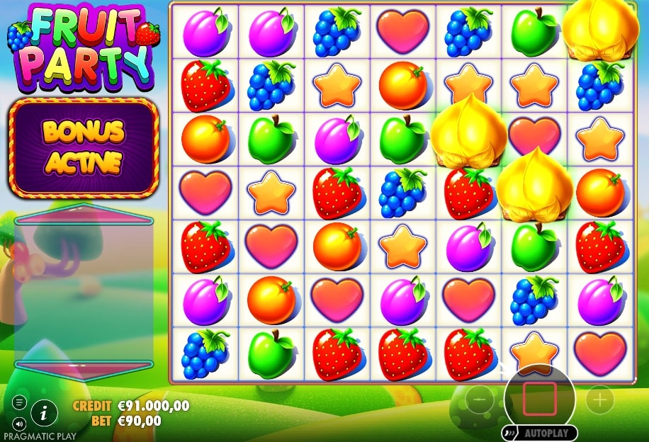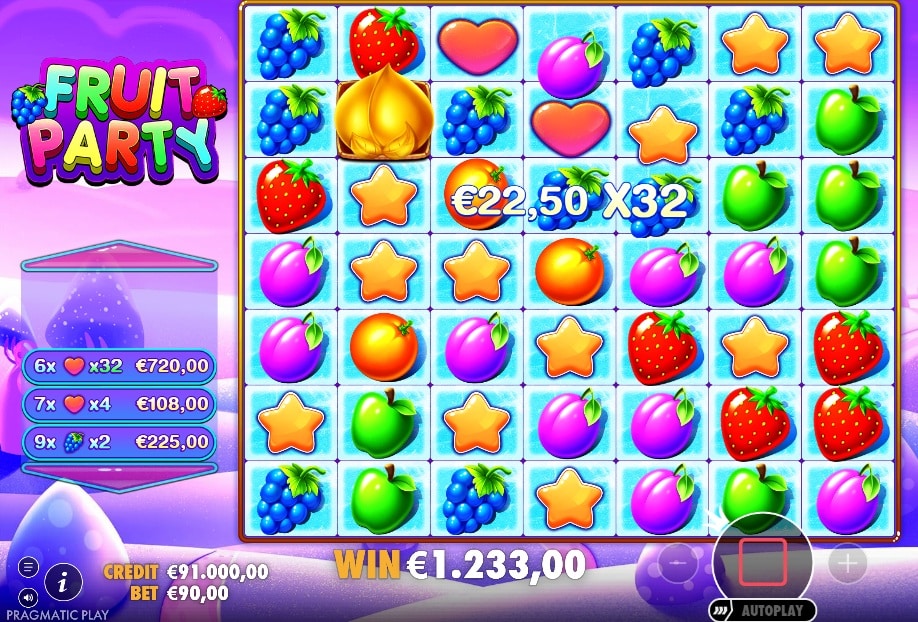 Het speelveld bestaat uit een raster van 7 bij 7 symbolen. In plaats van winlijnen werkt Fruit Party met het Cluster Pays systeem. Je wint door groepjes van vijf of meer identieke fruitsoorten (of harten en sterren) te vormen die elkaar horizontaal of verticaal raken. Zodra zo’n cluster ontstaat verdwijnen de symbolen en vallen er nieuwe van boven naar beneden om de gaten te vullen. Dit mechanisme zorgt ervoor dat je met één druk op de knop een hele reeks aan winsten kunt binnenhalen. Het is vergelijkbaar met de gameplay van populaire mobiele puzzelgames zoals Candy Crush wat het erg toegankelijk maakt voor nieuwe spelers.