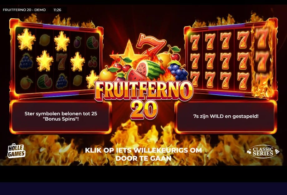 Fruitferno 20 is de nieuwste release van Hölle Games. Deze fruitautomaat gaat terug naar de basis; een klassieke fruitautomaat zonder gekke poespas. Kersen, citroenen en meloenen sieren deze 5×3-gokkast. Daarnaast zijn er wild-symbolen én scatters. Deze scatters wil je graag tegenkomen; wanneer er 3 in je beeld verschijnen speel je de bonusgame vrij. Wanneer deze wordt opgestart krijg je 10 gratis spins.