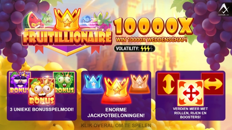 Fruitillionaire is een beetje een vreemde eend in de bijt. Het thema met het boze fruit is origineel en grappig uitgevoerd maar het gebrek aan achtergrondverhaal is jammer. Qua gameplay leunt het zwaar op het bekende ‘3-potten systeem’ dat we inmiddels op veel plekken zien. Het is effectief en spannend omdat je bij elke verzameling hoopt op een trigger maar heel vernieuwend is het niet. De maximale winst van 10.000x is echter serieus geld en maakt het de moeite waard. De toevoeging van de verschillende modifiers in de bonusronde zorgt voor genoeg variatie om het leuk te houden. Een degelijke slot voor liefhebbers van Hold & Win games die eens wat anders willen dan Egyptische goden of Ierse kabouters.