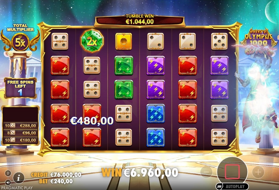 De grote aantrekkingskracht van dit spel zit hem, net als bij de reguliere Gates of Olympus 1000, in de multipliers. Zeus zweeft naast de rollen en kan op willekeurige momenten bollen op het veld smijten. Deze bevatten vermenigvuldigers variërend van 2x tot een gigantische 1.000x. Als je een winnende combinatie maakt terwijl er multipliers op het scherm staan, worden deze waarden opgeteld en toegepast op je totale winst van die Tumble-reeks. Dit mechanisme zorgt ervoor dat zelfs een kleine winst met simpele dobbelstenen kan uitgroeien tot een monsterlijke uitbetaling.