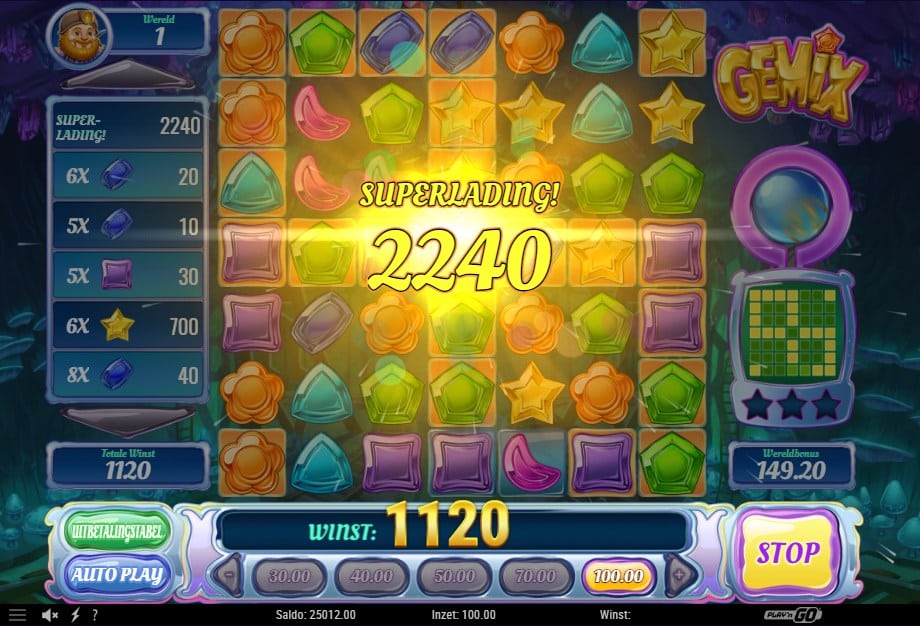 Het speelveld is een 7×7 grid met 49 symbolen. Je wint zodra 5 of meer gelijke symbolen aan elkaar grenzen, horizontaal of verticaal. Bij een hit verdwijnen de winnende symbolen en vallen er nieuwe naar beneden. Dat blijft doorgaan tot er geen nieuwe clusters meer ontstaan. Zo’n “doorrolrondje” kan ineens langer duren dan je denkt, en dat is precies wat Gemix lekker maakt: je voelt continu dat er nog iets kan gebeuren.