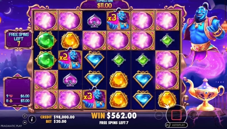 De Genie’s Gem Bonanza demo van Pragmatic Play speelt zich af op een 6×5 grid met het populaire scatter-pays mechanisme. Je wint zodra 8 of meer identieke symbolen ergens op de rollen verschijnen (vrijwel identiek aan andere slots zoals Gates of Olympus 1000). Dankzij de tumble-feature verdwijnen winnende symbolen, waardoor nieuwe combinaties kunnen ontstaan. Met inzetten van €0,20 tot €240, hoge volatiliteit, een maximale winst van 10.000x je inzet en een RTP tot 96,5% is er volop potentieel voor grote prijzen.