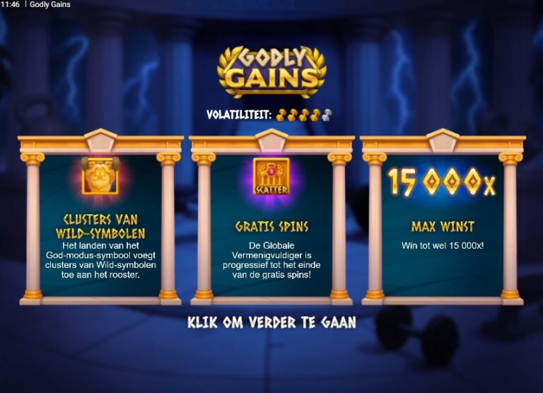 Vergeet de tempels op de Olympus; de goden zijn verhuisd naar de sportschool. In Godly Gains van Bullshark Games (Hacksaw) ontmoet je een gespierde, Zeus-achtige figuur die meer geïnteresseerd is in ‘max reps’ dan in het gooien van bliksemschichten. Deze gokkast combineert een hilarisch en absurd thema met de explosieve kracht van een ‘Cluster Pays’-grid, compleet met cascades. De ware kracht van deze goden zit hem echter in de free spins-ronde, waar een progressieve, globale winstmultiplier niet reset tussen de spins. Met een goddelijke maximale winst van 15.000x de inzet, is dit een ‘workout’ die je niet wilt overslaan.