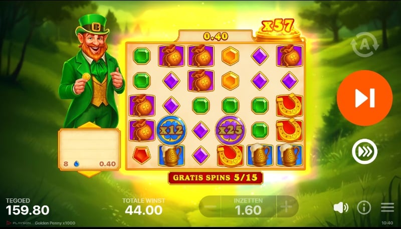 Wanneer je 4, 5 of 6 ‘Leprechaun’-scatters landt, begint het feest pas echt met respectievelijk 15, 20 of 25 gratis spins. De bonusronde kent een cruciale en extreem krachtige upgrade: er is een ‘Total Multiplier’-meter actief. Elke keer dat je een multiplier-symbool landt (tijdens een winnende spin), wordt de waarde ervan opgeteld bij deze globale meter. Deze meter reset niet tussen de spins en kan dus alleen maar groeien. De totale multiplier wordt vervolgens toegepast op elke volgende winst, mits er die spin ook een nieuw multiplier-symbool landt. Land je 3 of meer scatters tijdens de bonus, dan krijg je +5 extra spins.
