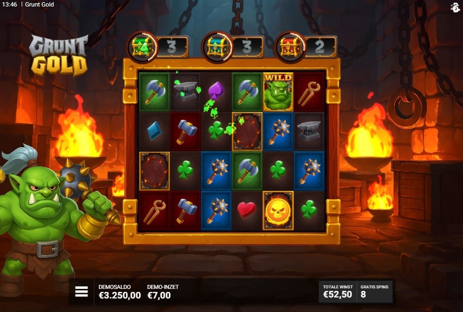 Het spel speelt zich af op een 6×4 raster dat wordt bewaakt door een zwaarbewapende ork. In plaats van vaste winlijnen werkt Grunt Gold met ‘ways to win’. Zolang je symbolen op opeenvolgende rollen draait (beginnend bij links) heb je prijs. Dit levert in totaal 4.096 winmanieren op. Daarnaast is er een cascade-mechanisme actief. Winnende symbolen verdwijnen en nieuwe vallen naar beneden om de gaten te vullen. Dit zorgt ervoor dat het tempo lekker hoog ligt en je met één inzet meerdere keren kunt winnen.