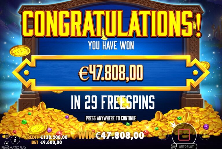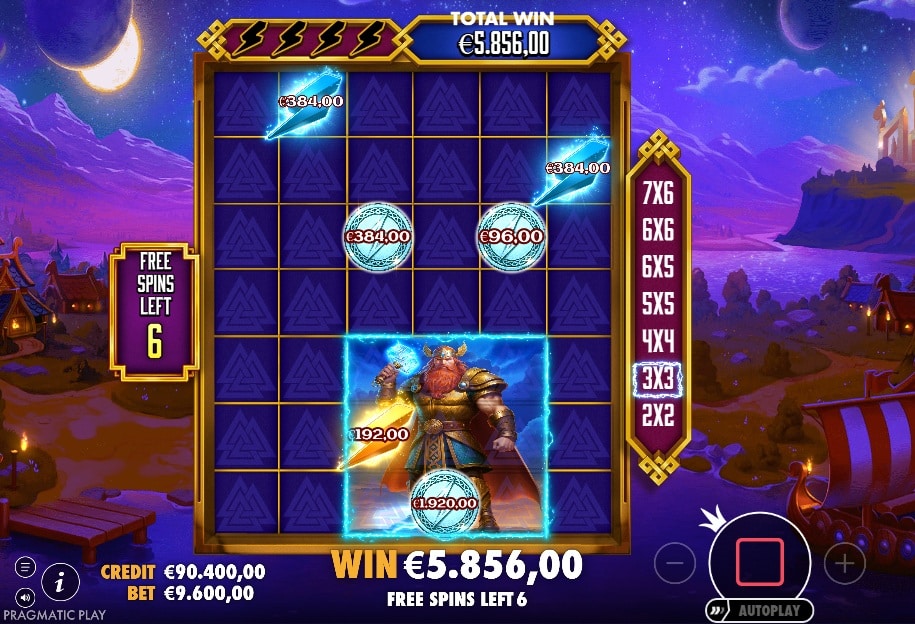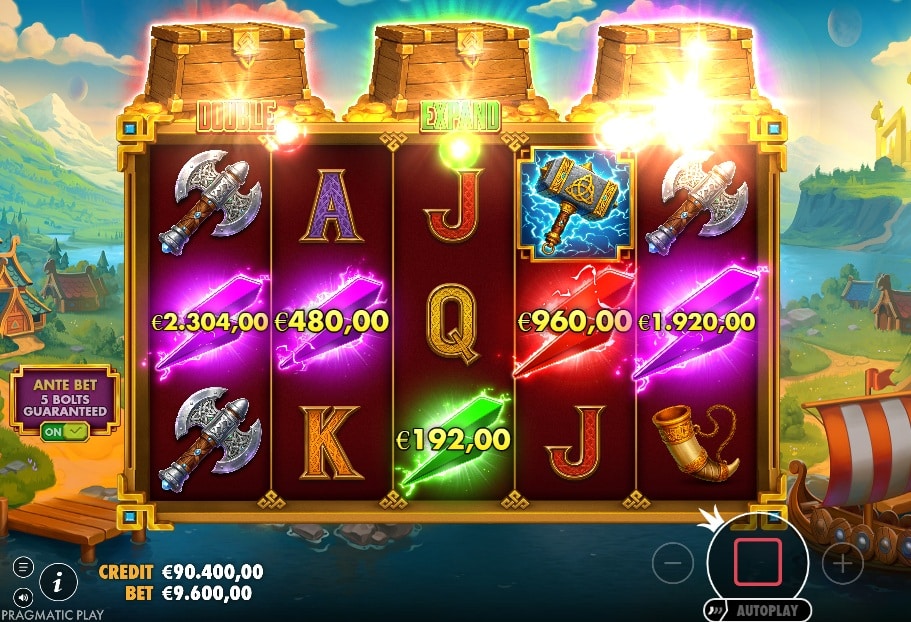 Het avontuur speelt zich af op een 5×3 raster met 40 vaste winlijnen, tegen een prachtige achtergrond van een Viking-dorp in een vallei. De basisgame is een constante, spannende jacht op ‘Lightning’-symbolen (bliksemschichten). Deze symbolen hebben drie kleuren (rood, groen, paars) en worden verzameld in drie kisten boven de rollen. Elke keer dat je een ‘Lightning’-symbool verzamelt, maak je kans om de ‘Respins’-bonus te activeren met de bijbehorende ‘modifier’. Land je het ‘Thor’-symbool (alleen op rol 1) tegelijk met een ‘Lightning’-symbool, dan activeer je de bonus gegarandeerd.
