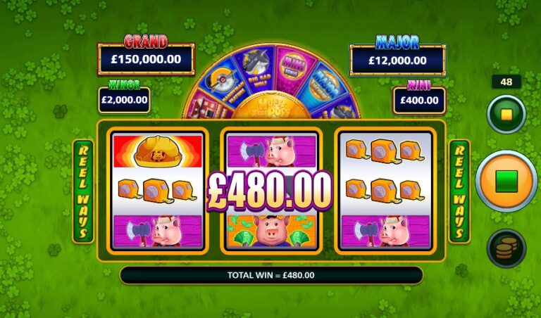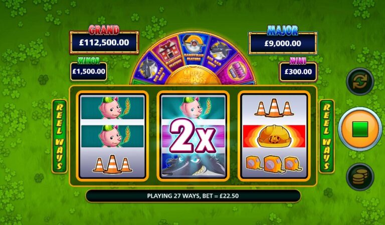 Naast het prijzenwiel is er ook de meer traditionele ‘Free Games Feature’, die je activeert door 3 ‘Hard Hat’-symbolen te landen. Dit start de bekende ‘huisjes-bouw’-bonus. Tijdens de gratis spins is het je doel om meer ‘Hard Hat’-symbolen te landen. Elk symbool voegt een nieuw ‘frame’ toe aan het veld of upgrade een bestaand frame van stro naar hout, en van hout naar steen. Aan het einde van de bonusronde veranderen alle frames in huisjes die directe geldprijzen of een van de vier vaste jackpots onthullen. De standaard RTP is een solide 96%.
