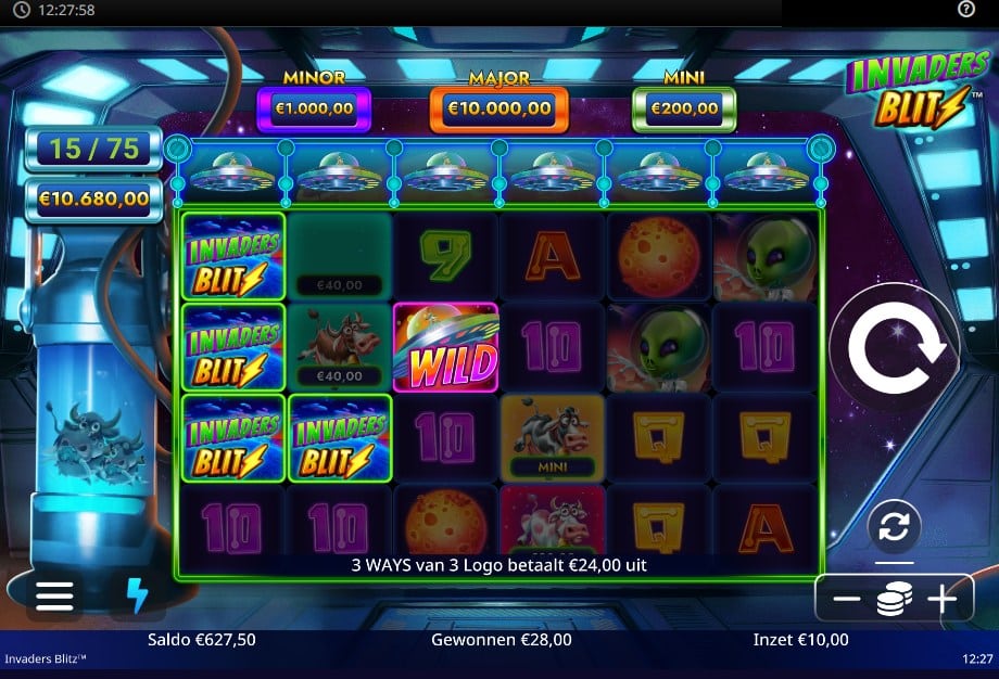 Invaders Blitz draait op “3-op-een-rij” ways: je wint als je 3 of meer dezelfde symbolen op aangrenzende rollen landt vanaf links. De lage symbols (9 t/m A) betalen redelijk maar niet spectaculair; de premium icons (planeten, gadgets, personages) maken het verschil. De wild (ruimteschip) helpt combinaties maken, maar bemoeit zich niet met de echte sterren van de show: de koeien en collect-symbolen.