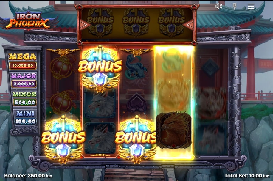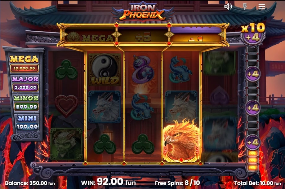 Het basisspel vindt plaats op een standaard raster van 5 rollen en 3 rijen met 20 vaste winlijnen. De inzetrange is breed en loopt van een dubbeltje tot €100. De RTP is met 96,24% dik in orde. Wat direct opvalt als je begint te draaien is de extra ‘Phoenix Reel’ die boven de middelste drie rollen zweeft. Hierop draaien constant prijzen mee: directe geldwaardes, scatters en vier verschillende jackpots (Mini, Minor, Major, Mega).
