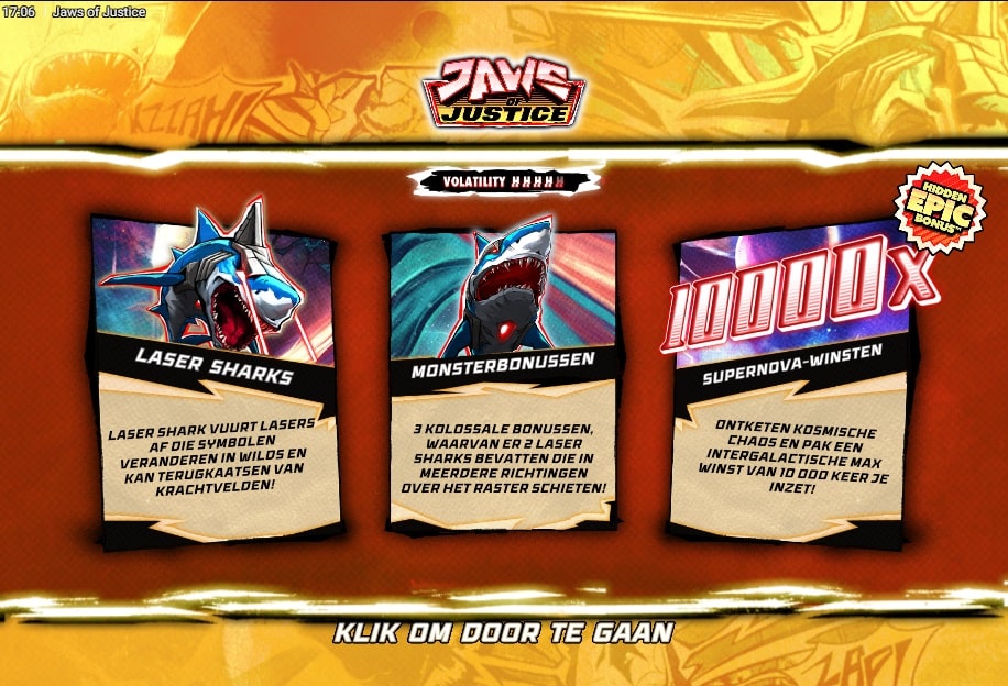 Jaws of Justice is Hacksaw Gaming in topvorm: een absurd, humoristisch thema gecombineerd met een diepgaande en extreem volatiele mechaniek. De ‘Laser Shark’-feature is een fantastische en zeer visuele ‘spreading wild’-variant. De gelaagde bonusrondes zorgen voor een enorme herspeelbaarheid. Het spel voelt als een knotsgekke spirituele opvolger van de Razor Returns-serie, maar dan in de ruimte. Voor de ongeduldige ruimte-haai is er een uitgebreid Feature Buy-menu. Een absolute must-play voor de liefhebber van creatieve en explosieve gokkasten. Start de lasers en speel de Jaws of Justice demo!